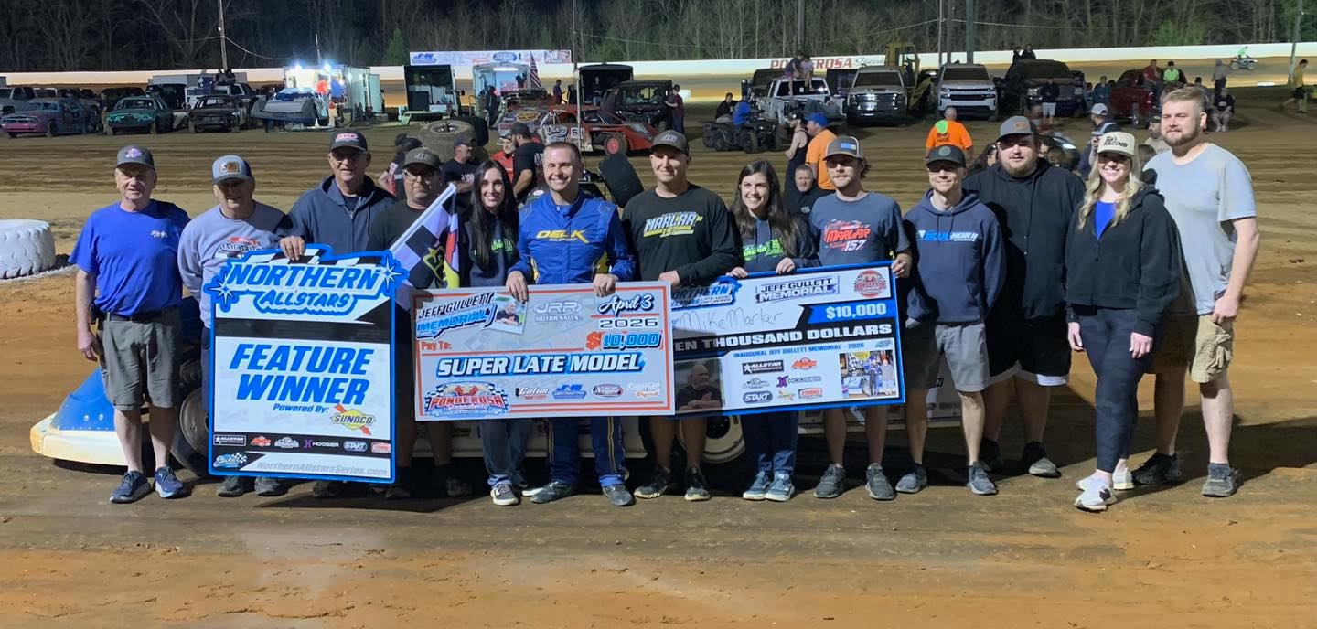 HOPE, IN (April 4, 2026) – Mike Marlar on Winfield, Tennessee captured his first Northern Allstars Late Model Dirt Series Powered by Sunoco Race Fuels main event since 2007 as he won the Inaugural Jeff Gullett Memorial on Friday night at the Ponderosa Speedway. The track now promoted by Jaime Stumpf and Joshua Messer had 106 cars on hand for the special event honoring Jeff Gullett, who passed away in September of 2024.